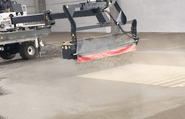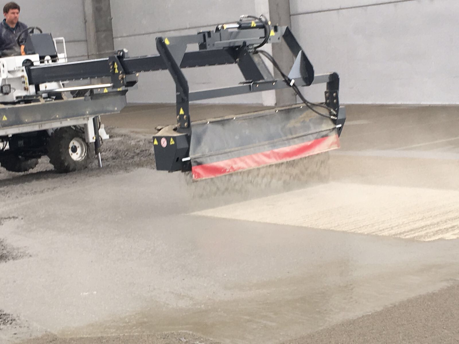 Detrás de la S-15R viene la espolvoreadora STS-11 M que con su brazo tambien extendible de 6metros de largo aplica materiales endurecedores superficiales como cuarzo o cuarzo corindón, desde 1kg/m2 hasta 7kg/m2 formando asi una capa de rodadura de alta resistencia.